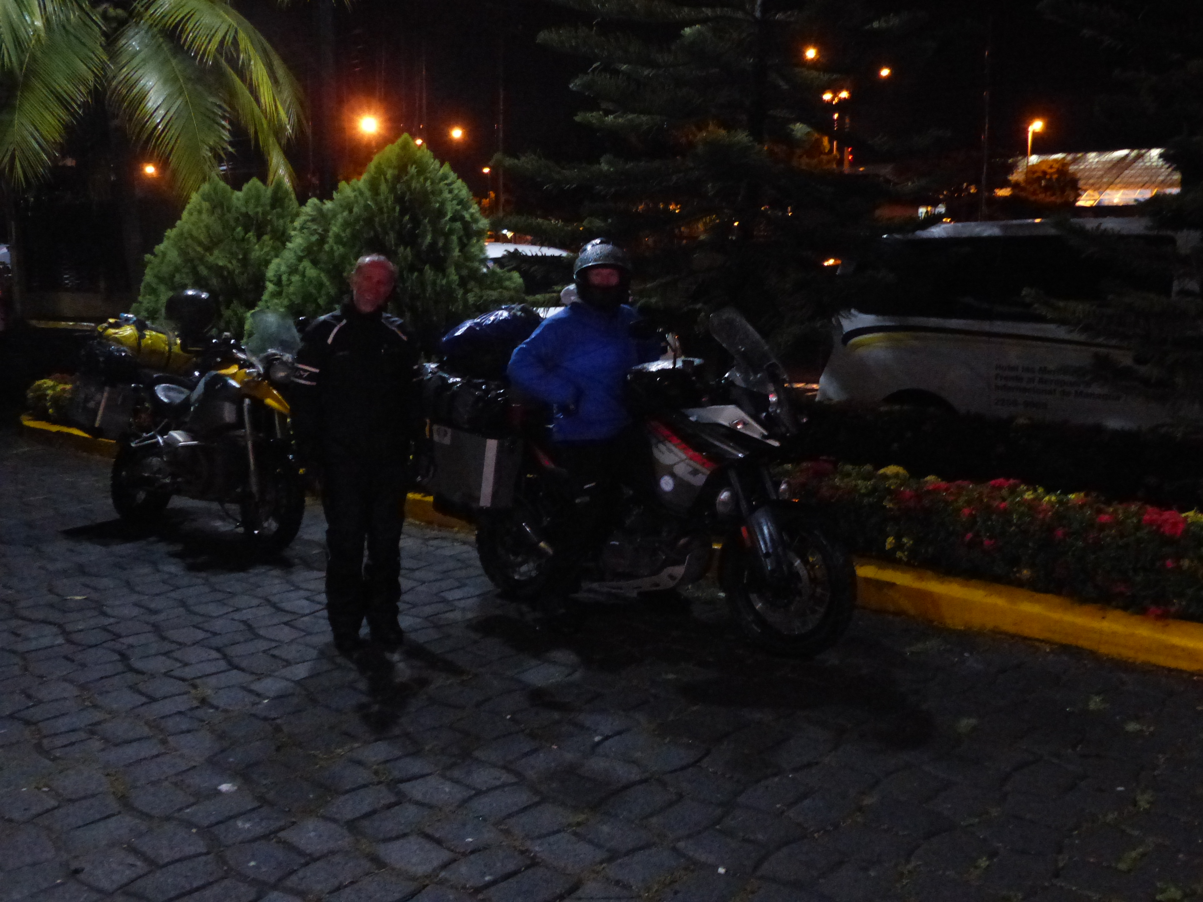 We left Danli for our border crossing into Nicaragua.  It was another three hour crossing with Lindsay suffering badly from the flu.  We had to get our temperatures taken, because of Chikangunya fears, to get into the country….luckily he passed!  Once we were through we were determined to make it all the way to Managua.  We had entertained the idea of stopping earlier, but none of the towns we came across felt very inviting.  So it was a marathon ride….luckily the roads were in beautiful shape, a huge change after the potholed Honduran experience.  About an hour and a half before getting to Managua the skies socked in and at 4:00 we were losing light…..then lightning engulfed us and the downpour started.  It was torrential, but there was nothing to do but continue.  Then night set in and it was almost impossible to see as our shields were completely fogged up and the rain was sheeting down on us. Trees had been blown down across the road and officials were guiding traffic by with flashlights.