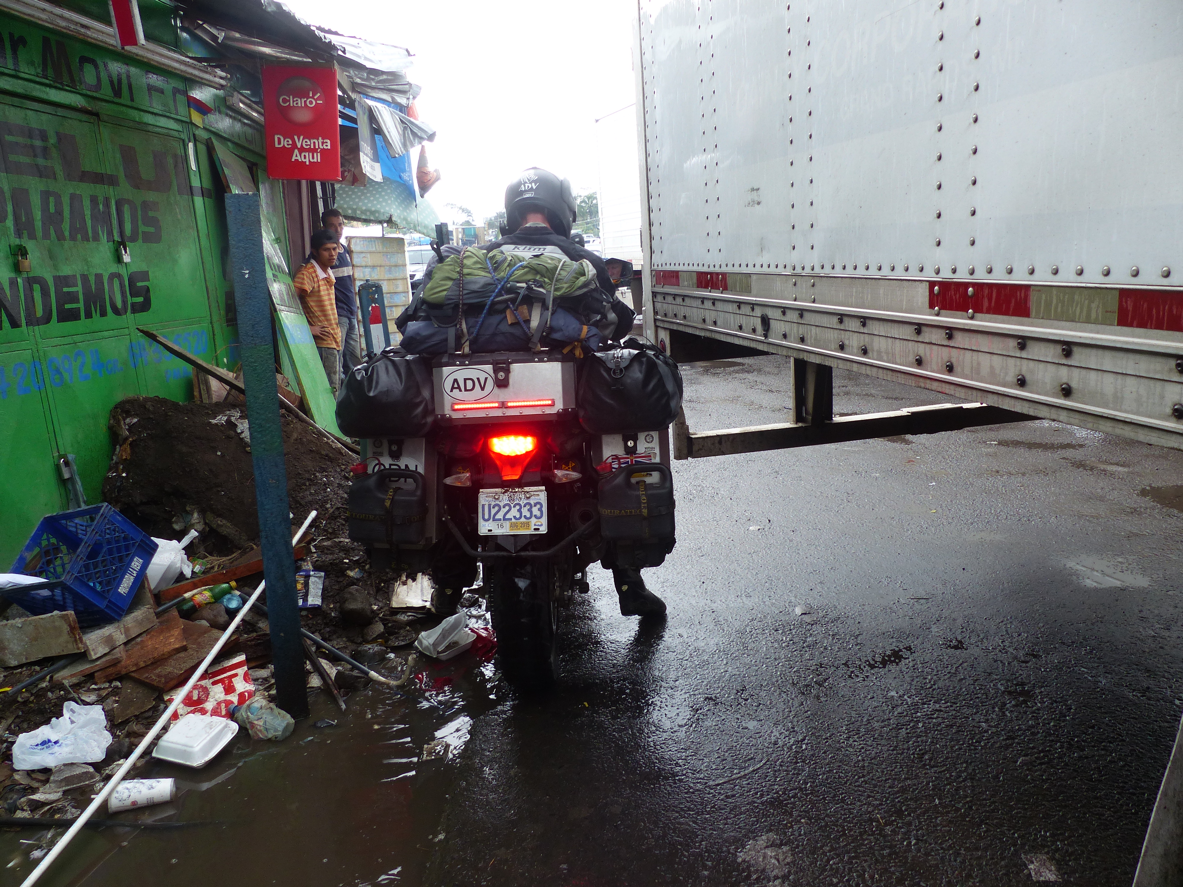 We made the decision to cross the border in the afternoon because we believed that it was a relatively fast crossing. Now as we were standing in the diesel exhaust saturated air looking out at the pouring rain with dark setting in, we were becoming a bit concerned about what our ride to David, our destination for the day, would look like. Finally around 4:30 we had all the paperwork we needed and just had to go through the spraying of the bikes and the last check stop. The rain had lightened and then stopped and the road into David turned out to be a well lit four lane highway. Things were feeling better.