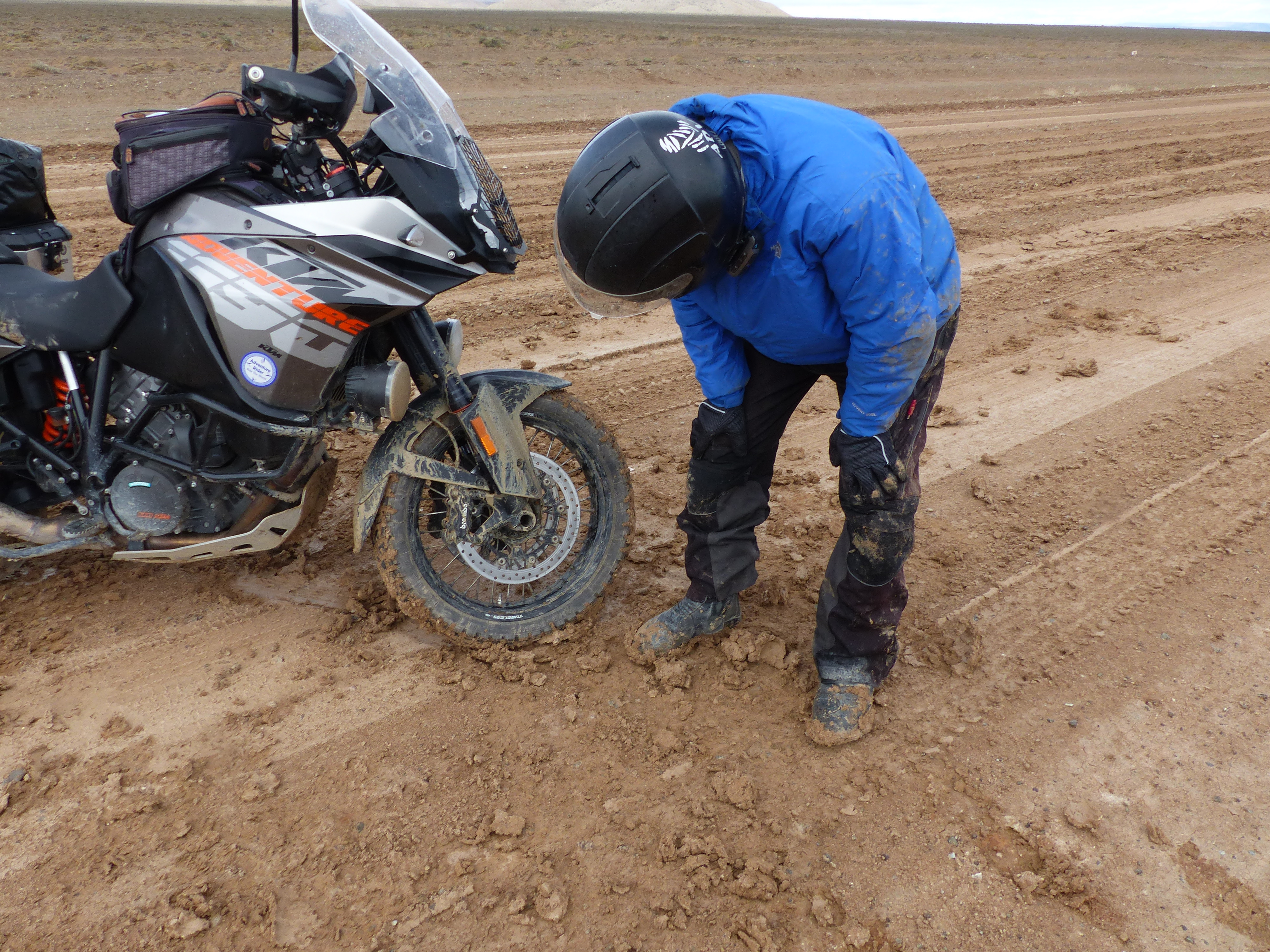 As we were removing the fender and cleaning up the tire two bikes came cruising over the horizon. Our jaws dropped! As they approached they rode over the mud on their street tires then came to a halt. They told us the road was in good condition, we just needed to get past this part, and we noticed that where the grader had passed earlier on the other side of the road things were already drying out, no caking on their tires. We were hopeful. Lindsay got the bike back together and off we went, knowing that the road was passable.