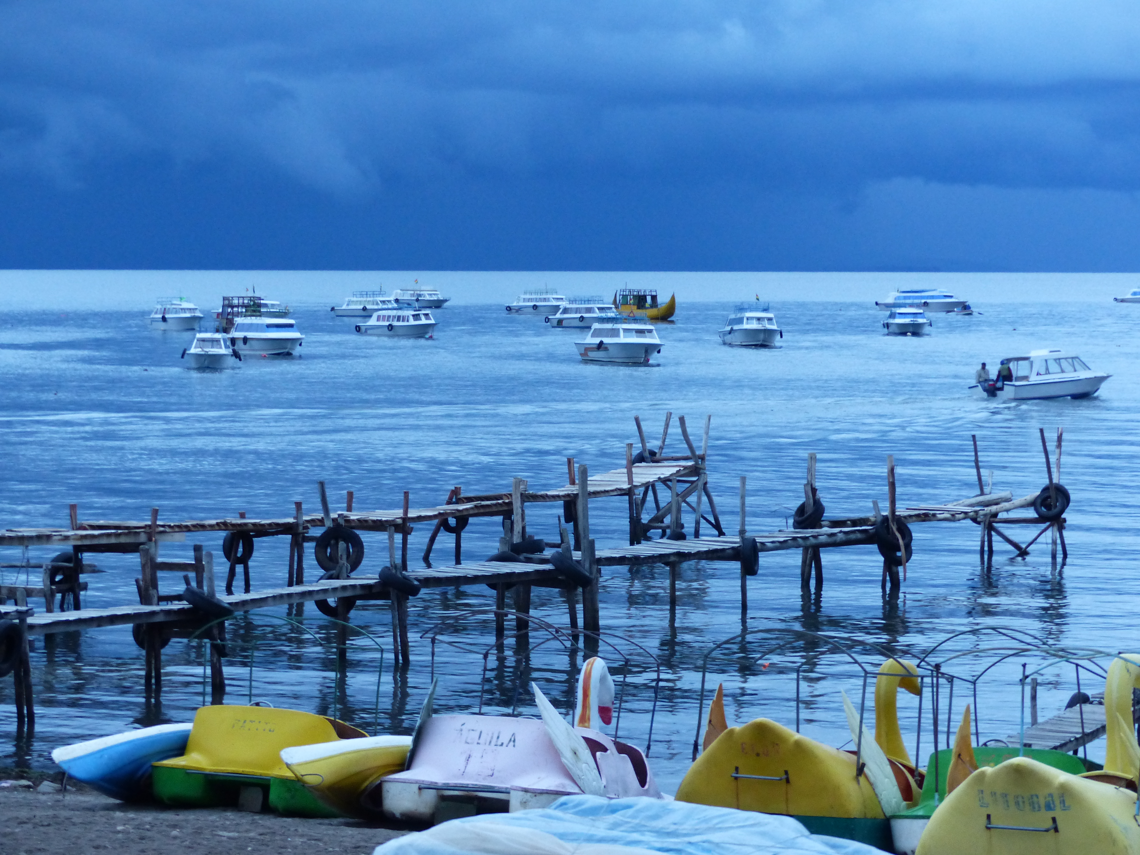 After the border we rode the 8 km to the resort town of Copacabana on Lake Titicaca. The town is a vibrant tourist resort with many young foreign tourists roaming the shops and cafes. Temperatures were cold and as evening closed in so did a storm, making for some beautiful views.