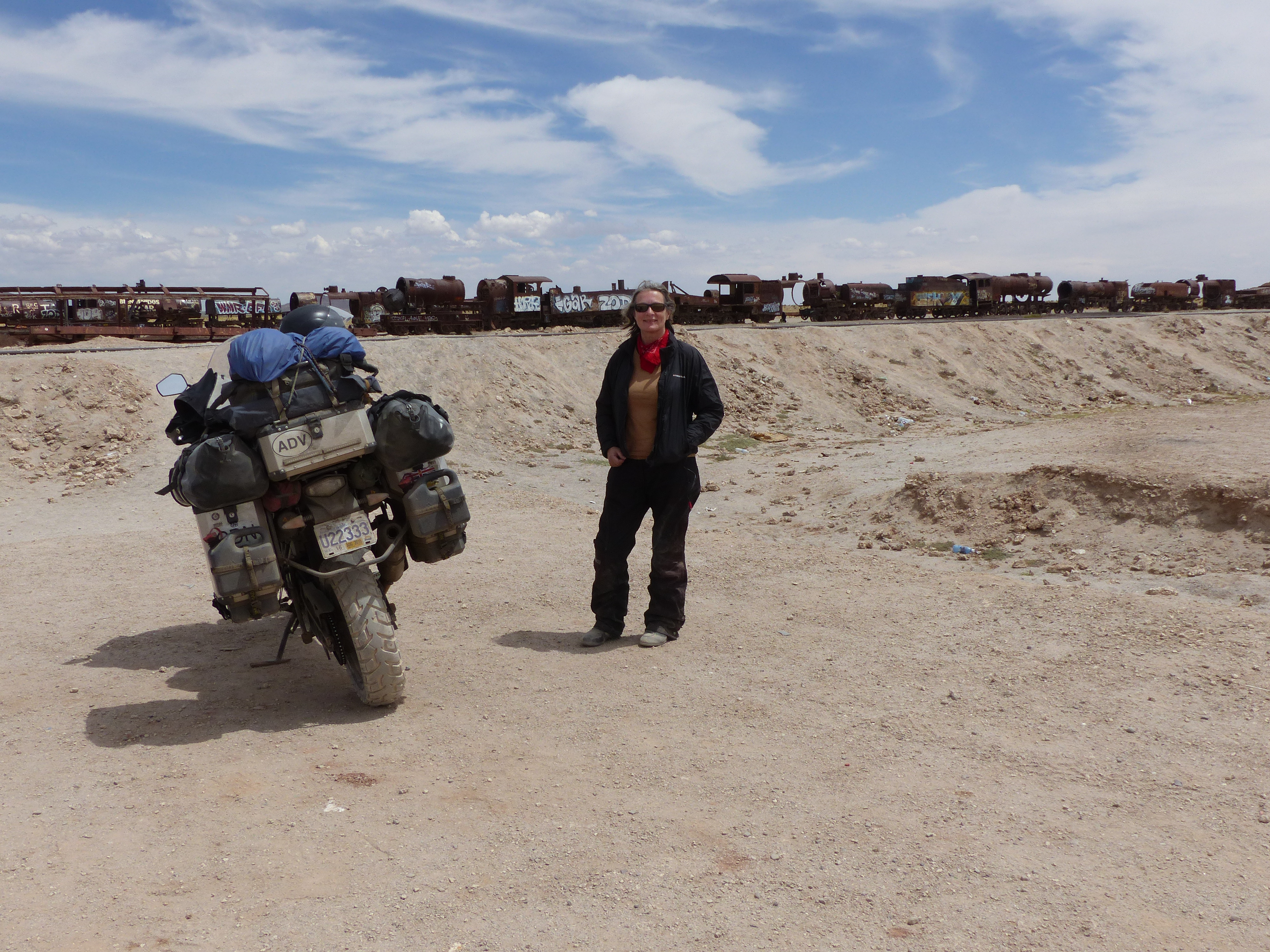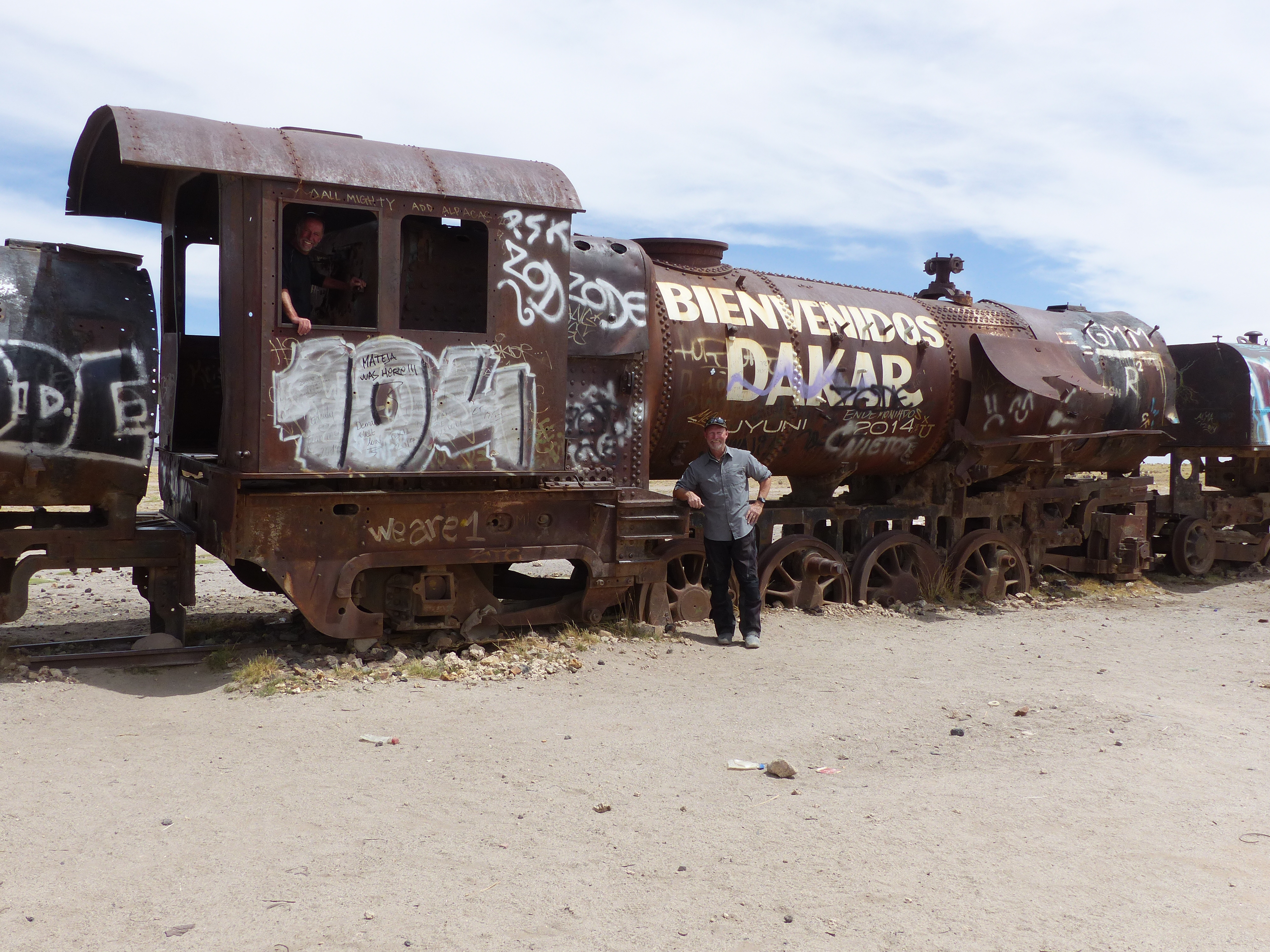 The train boneyard behind MarianA locomotive in a sorry state, proclaming the upcoming Dakar Race.