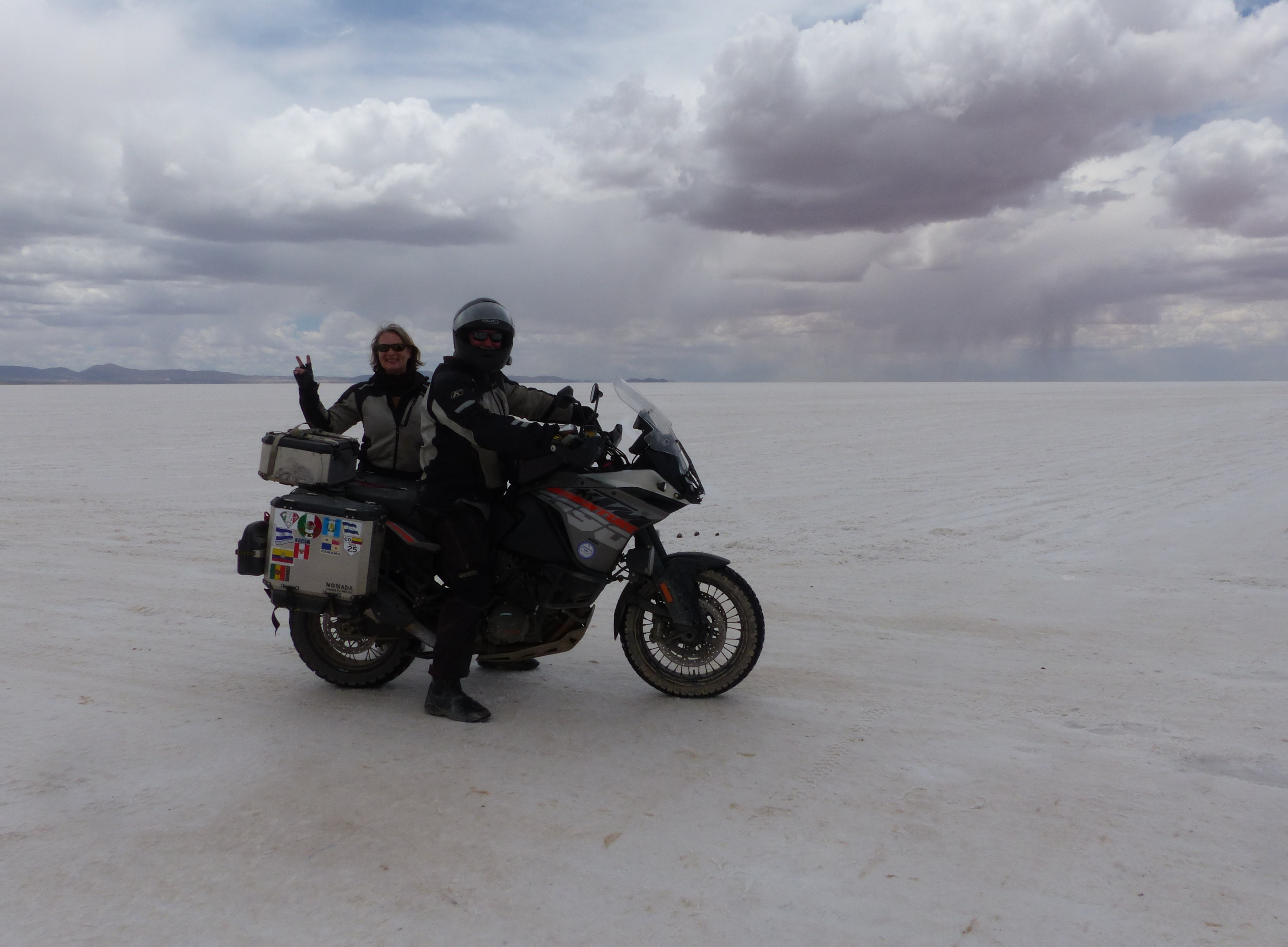 The next day we rode onto the Salar. You can ride for many kilometres but because we had been unable to get gas in the small village nearby, we were limited in range. We had been warned that the salt gets everywhere on the bike and it has to be washed off thoroughly. We rode for a couple of hours and returned to the hotel before a cloudburst. Tom and I then spent an hour washing the bikes off with pails of water; a high pressure washer would have been easier and more effective.