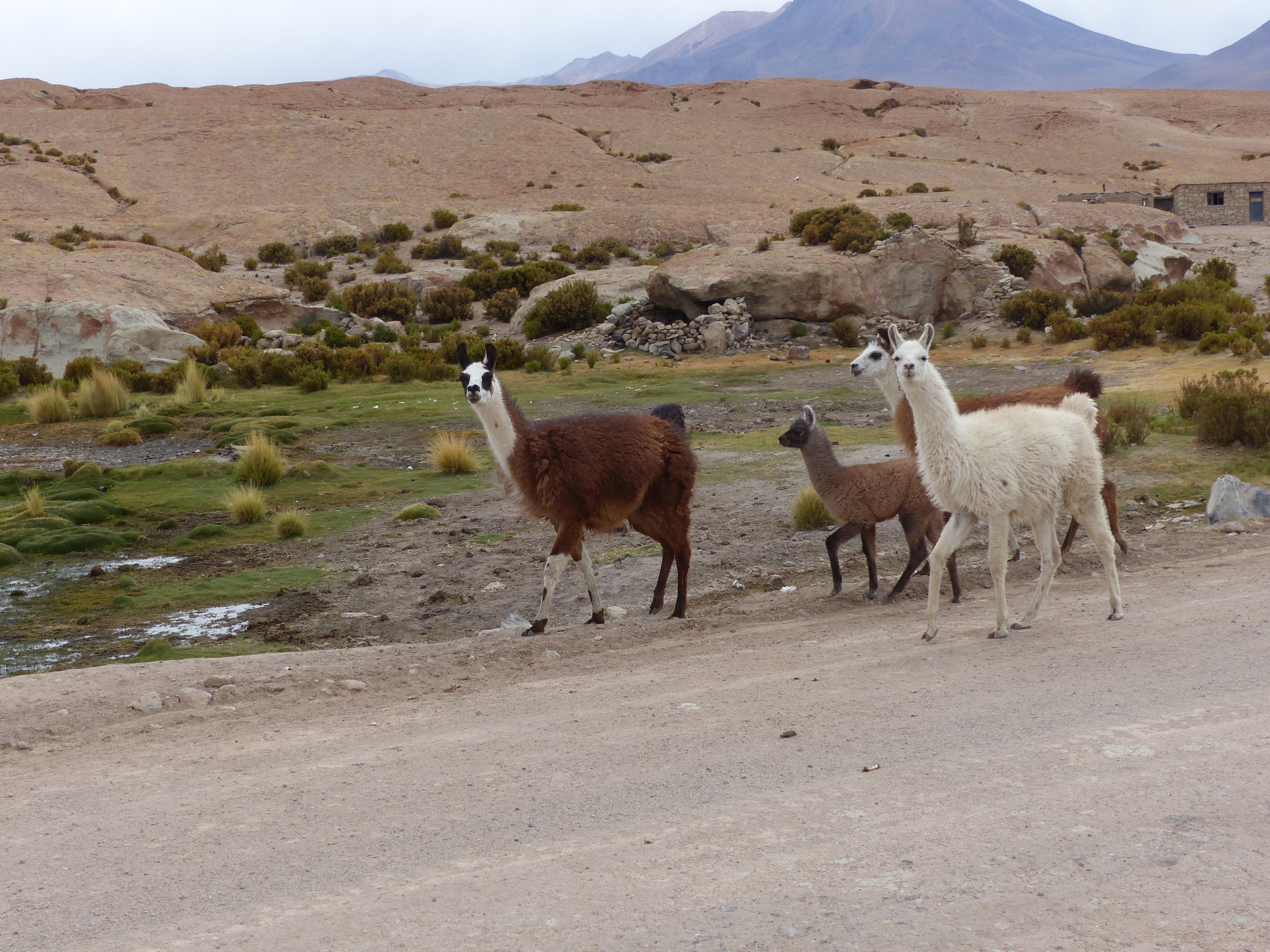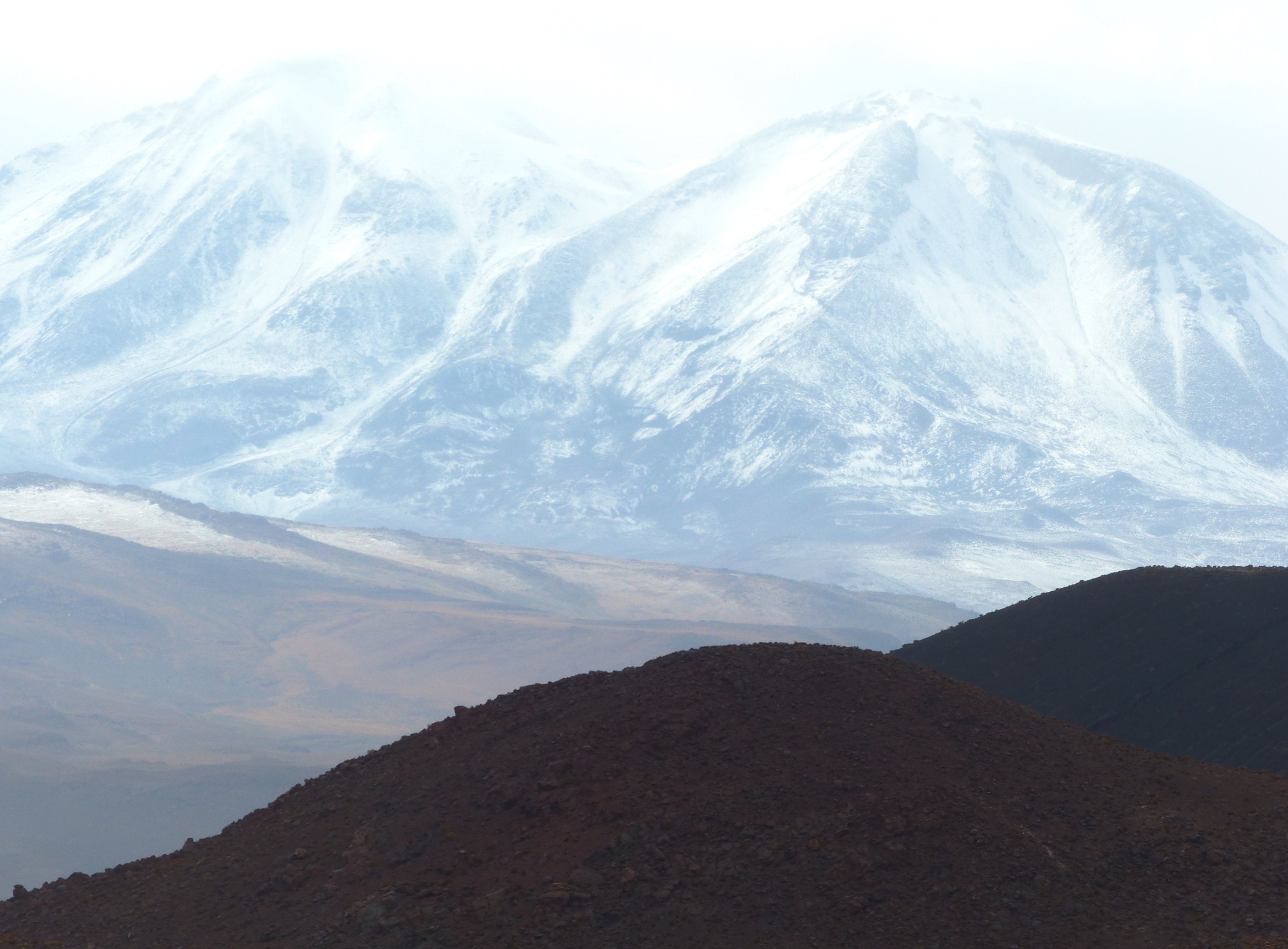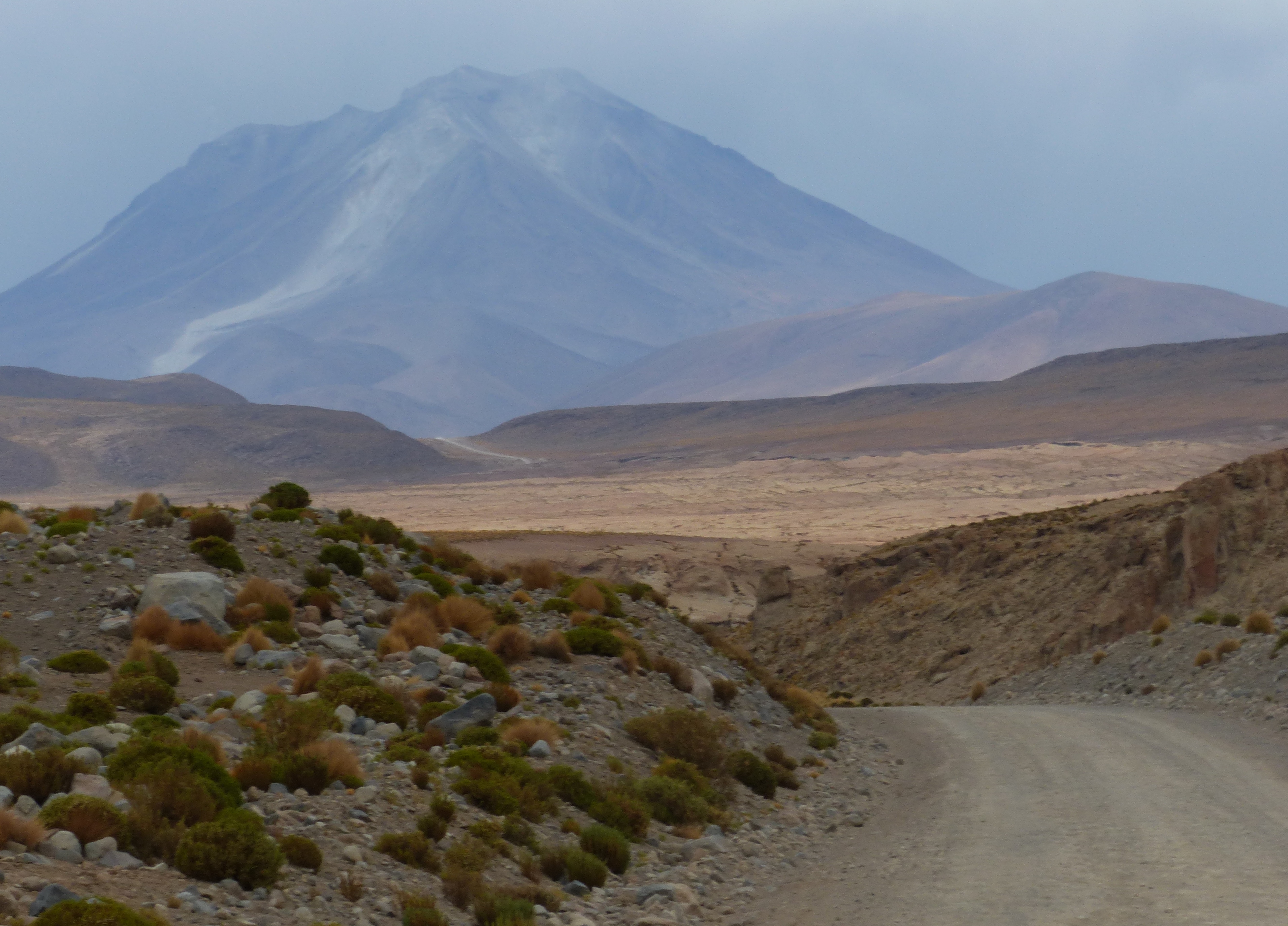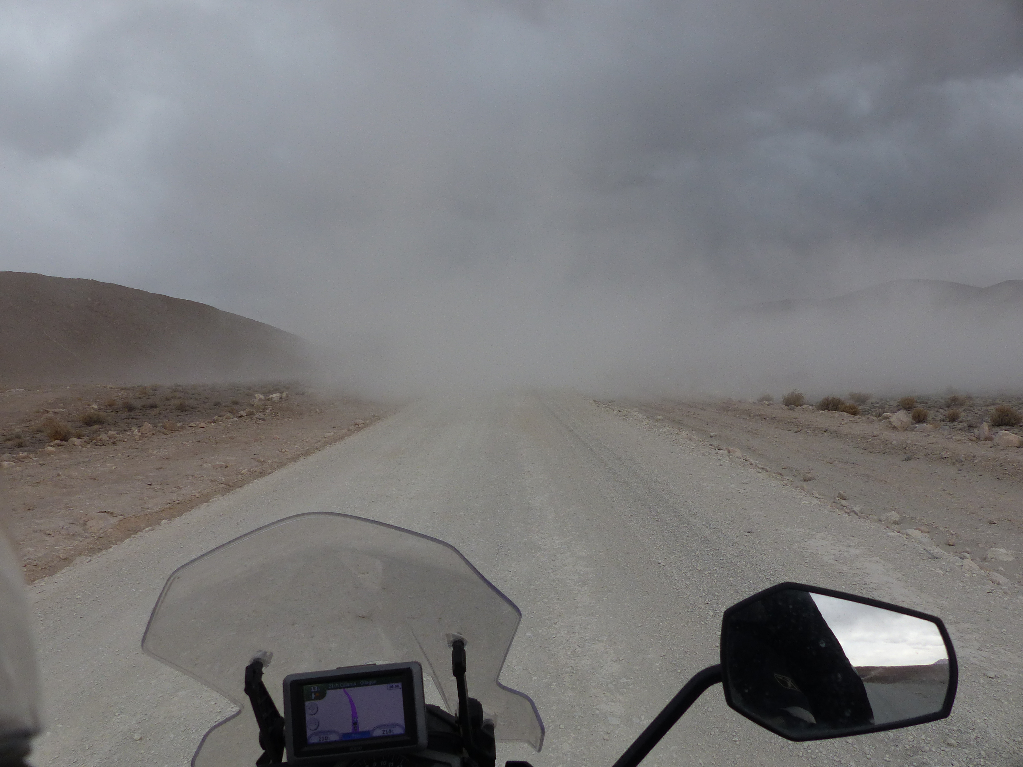 The following day was a long one, all on dirt roads. We ran into an intense storm a few kilometres before the border crossing into Chile at Ollague. It was very windy and little did we know that the slight coating of road mud we were riding through would prove to be a problem later on. The crossing was in the middle of nowhere but surrounded by beautiful peaks, volcanos and salt flats.