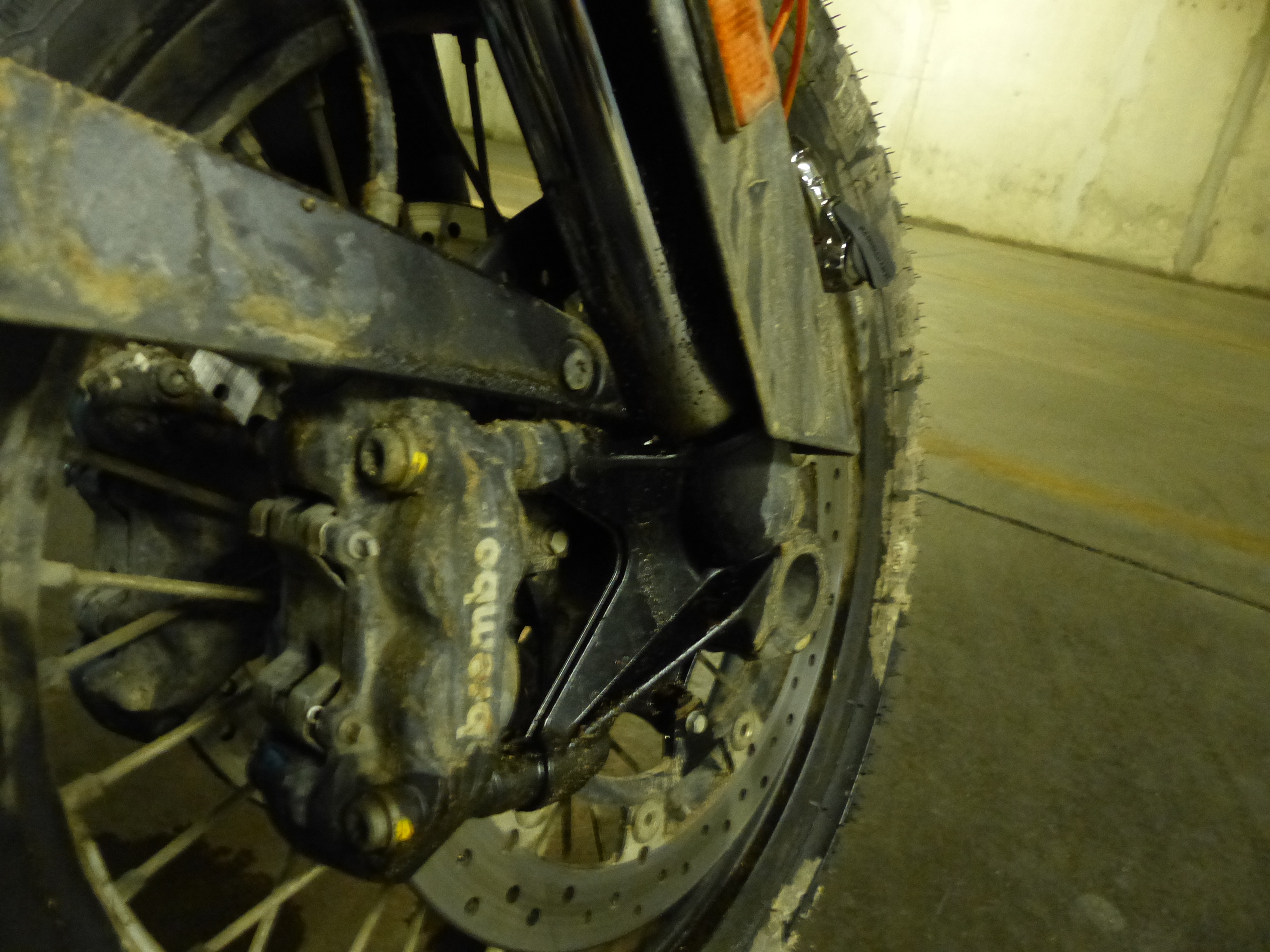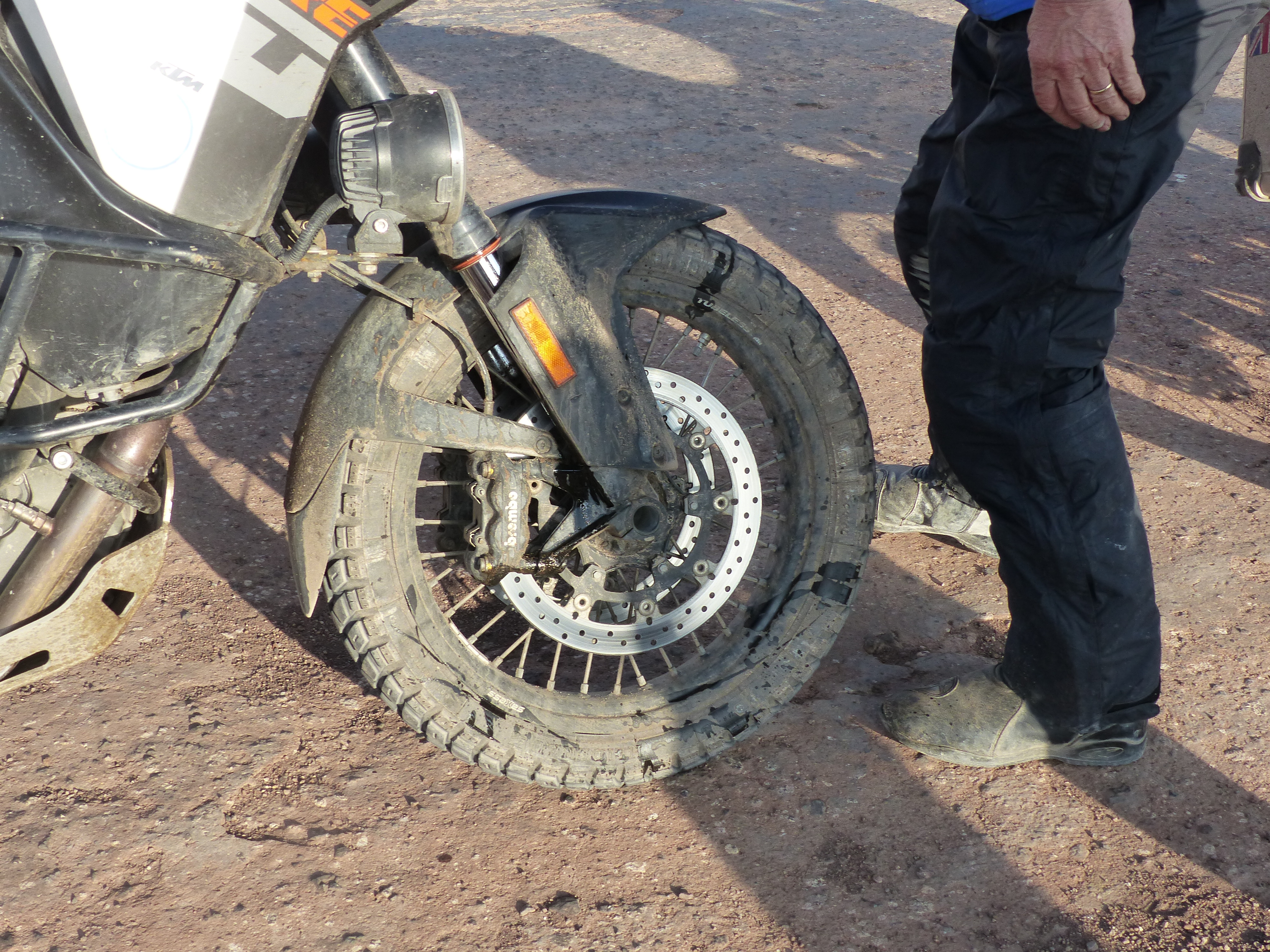 After many kilometres of dirt road in Chile, and spectacular scenery, we stopped for a breather and to our horror it was noticed that both front brake calipers on our bike were covered in fluid. It turned out that the mud film we had been riding on had hardened like concrete on the lower fork legs and when compressed over some major bumps the hard material had destroyed both fork seals. The next morning at the hotel in Calama, Lindsay tried to clean and fix the seals but to no avail. They would have to be replaced at the next KTM dealer in La Serena, several hundred kilometres away.