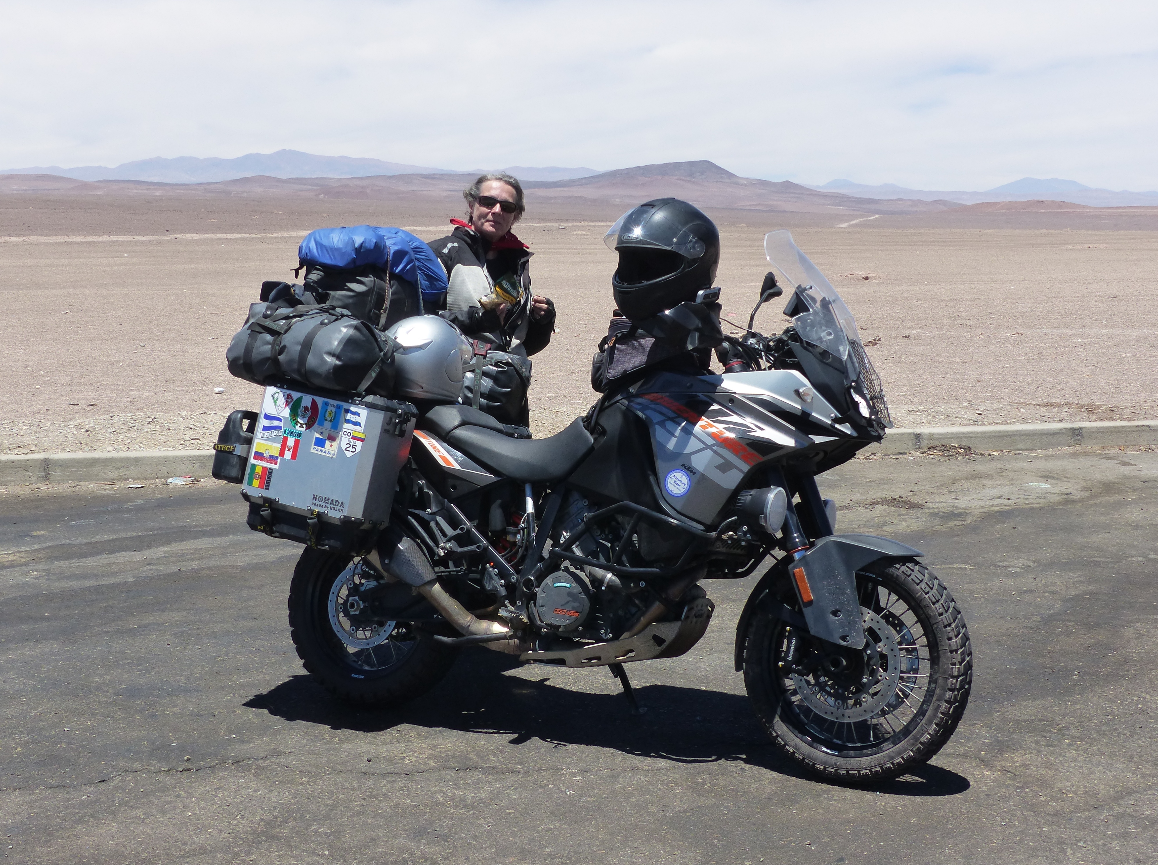 We set off for Antofagasta on the coast after having watched the first trucks and cars make it to the finish line. It was great to be riding beside the ocean again, but disaster was about to strike. Marian and I stopped at a police checkpoint when a guy in a car came over and told us in broken English that our friends had problems. We rode back along the highway and sure enough Tom and Tracy were stopped beside the road with the police. It turned out that the bike’s rear wheel bearing had not been ok and had seized while they were riding at 90 kph, luckily on a straight. There was a 30 metre black rubber strip on the road and Tom had managed to keep the bike upright. The two policemen had been very helpful, already having arranged a truck to transport the bike to Anotfagasta, 280 kms away. We rode on ahead with Tom and Tracy arriving at the hotel later that evening.