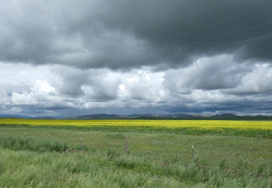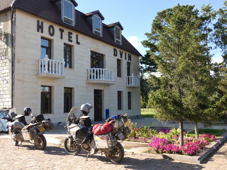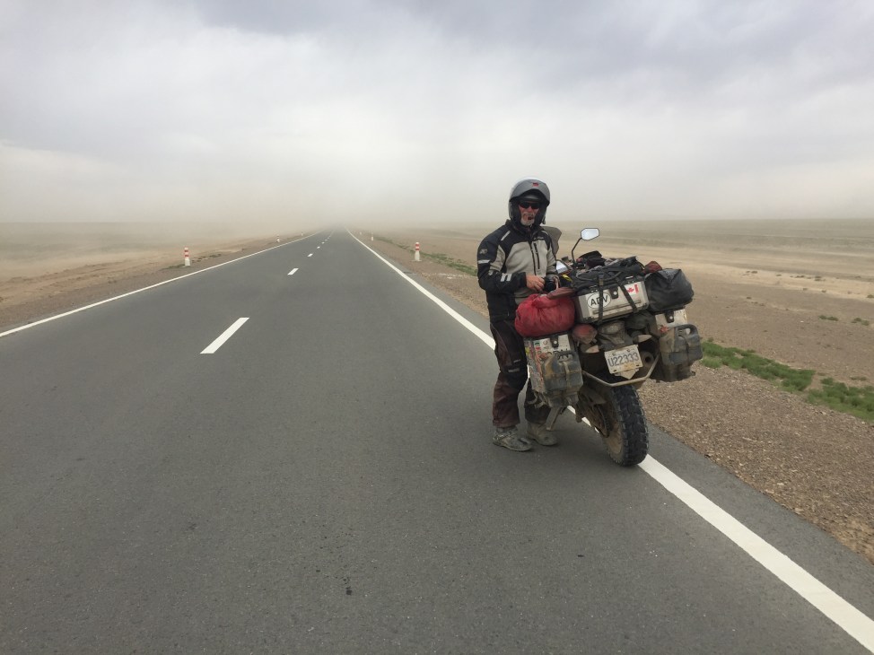 The next day was in total contrast to the previous one. The road was paved and the weather dry and hot hitting 33 deg. As we rode looking far ahead we thought we were going to hit dark clouds, but it turned out to be a vicious dust storm which was upon us in minutes and past us as quickly. We were able to have a great lunch in a newly built restaurant. We had met a biker in Altai who had recommended a hotel in Khovd but we could not find it. A guy at the gas station led us to another “best hotel” in town. It was new and after much discussion we were allowed to park the bikes in a private garage under the hotel. As the restaurant was occupied by a wedding party at first we could not get dinner. However the staff arranged for us to have dinner on the top floor outdoor patio. The waitresses could not have been more friendly and helpful. At C$50 for the room, this was more than double what we had become used to.
