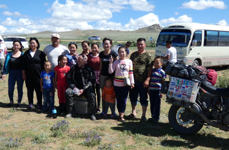 Tom and Lindsay left UB at ten am on Saturday and the traffic was light heading west. The objective was to ride to Tsetserleg where a guesthouse was booked. We were led to believe that this route was the best to give us options for different routes depending on weather and road conditions. The route north of the one chosen was shut down in one area due to hoof and mouth disease and further west the worst flooding in 40 years had washed out many bridges making the route impassable. During the ride we had to stop on an ongoing basis for cattle, sheep and horses on the road. We also saw a herd of wild camels. We started seeing colour in the steppe as the rains had brought out many flowers. As was becoming the norm wherever we stopped, a crowd would gather for photo ops. Overall the road was good and the guesthouse was reached by dinner time. It was very basic and Tom and I found ourselves to be the oldest guests by about thirty years. There was a good restaurant attached and chicken, chips and beer were enjoyed. One concerning issue during the day had been a recurring “general fault” warning being displayed on the bike’s instrument screen, accompanied by erratic fuel level and range readings. Everything else was working properly so no need to panic. Comforting was the fact that we were able to buy 95 and occasionally 98 Octane fuel (equivalent to 92 and 95 in N. America) every time we needed to fill up.
