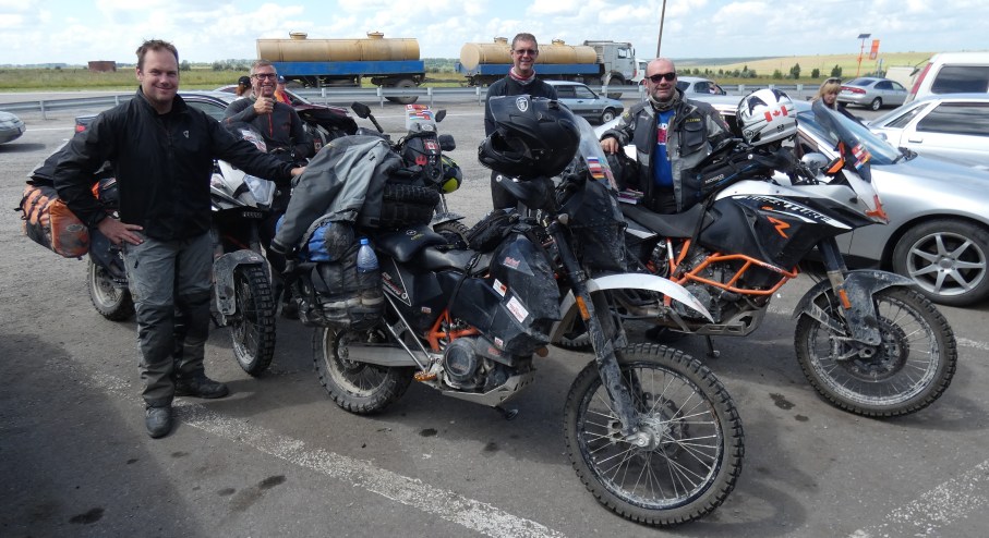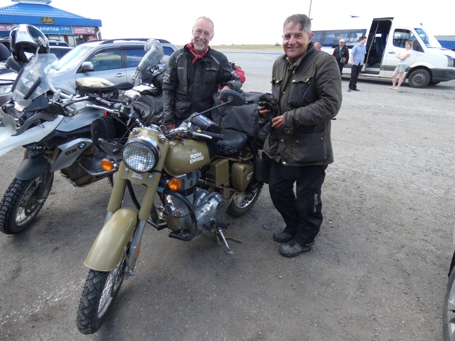 On our way to the border town of Robtsosvk, we pulled in to a cafe and met Frank from France traveling on a Royal Enfield! As we were having coffee, four bikes pulled in and to Tom’s and my amazement it was the guys from Alberta we had met in Eagle Plains enroute to Inuvik in 2016! We spent an hour with them trading stories. They had ridden from Germany and were headed to Omsk where they were going to store their bikes until next summer when they were to come back and complete their ride – small world!
