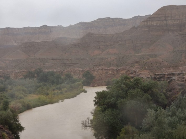 The green valley in sharp contrast to Kazakhstan’s dry terrain and an indication of precipitation.