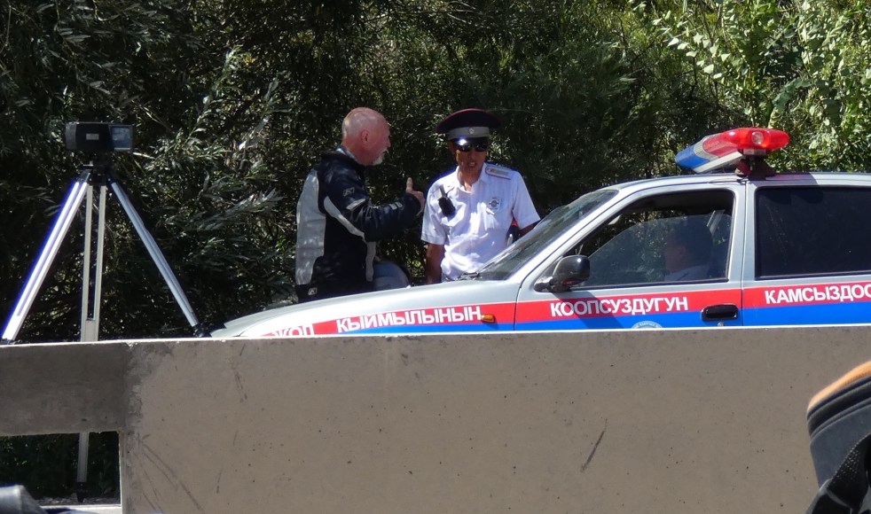 After a couple of very relaxing days it was time to make our way to Bishkek. Kyrgyzstan, we decided, has the most erratic and chaotic drivers we had experienced anywhere in our travels…..and we came to find that it also had the most policed road we had ever encountered…..but it seemed the ticketing was completely arbitrary…..as almost every driver could be ticketed for infractions. But it was our turn to encounter the system, and were fortunate this time. As we were riding with cars passing us on both sides, close enough to touch us as they were having a look, with speeding oncoming traffic, we came around a corner to see Tom and Tracy stopped by the police. The policeman saw us coming and waved at us, Lindsay decided he didn’t mean us, as the car in front kept going, and we were not speeding. Marian was a little concerned that Tom and Tracy might pay the price of our misinterpretation……Lindsay was not concerned…..but a kilometre down the road a policeman had crossed the center barrier and was definitely waving for us to pull over……. which we did. The man was very friendly and told us we should have stopped previously. Lindsay was then summoned over to the police car on the other side of the road and given a stern warning by the “boss”. Luckily after much explaining and a handshake we were on our way. Tom and Tracy had been equally lucky with no fine. On the remaining ride in to Bishkek we realized that we had never seen such a concentration of “the law”.