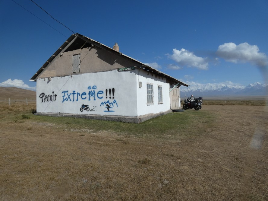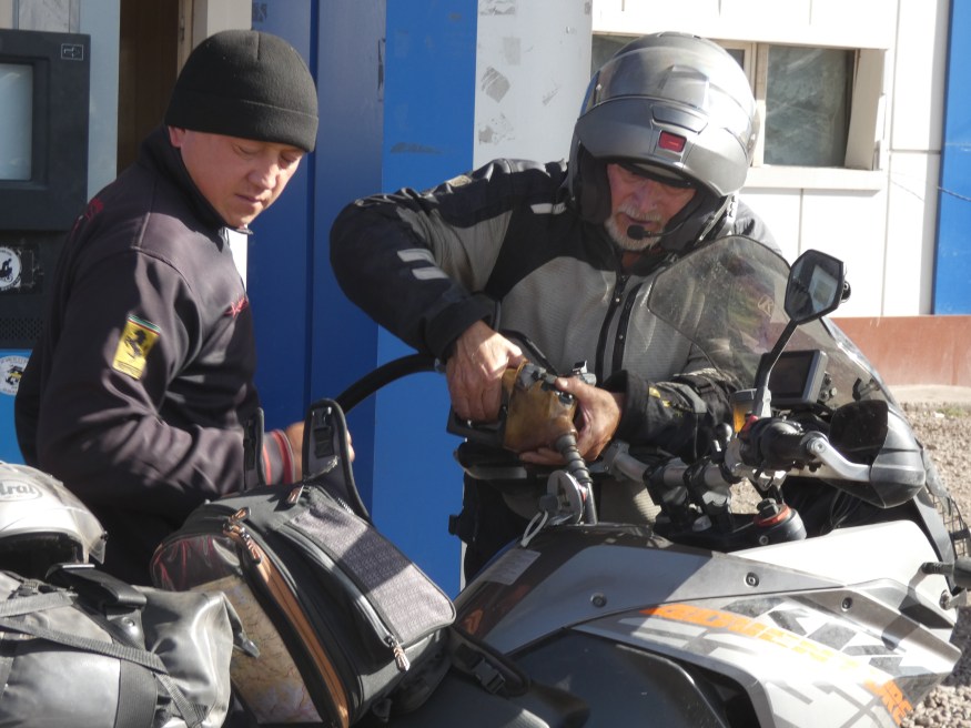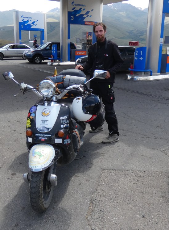 Fueling up we met a young Lithuanian man taking part in the Mongol Rally on this 50cc scooter…..to get through some of the passes in Tajikistan and Kazakhstan he had to unpack his scooter, ride up a ways, walk back down and retrieve his stuff and repeat. Arduous.